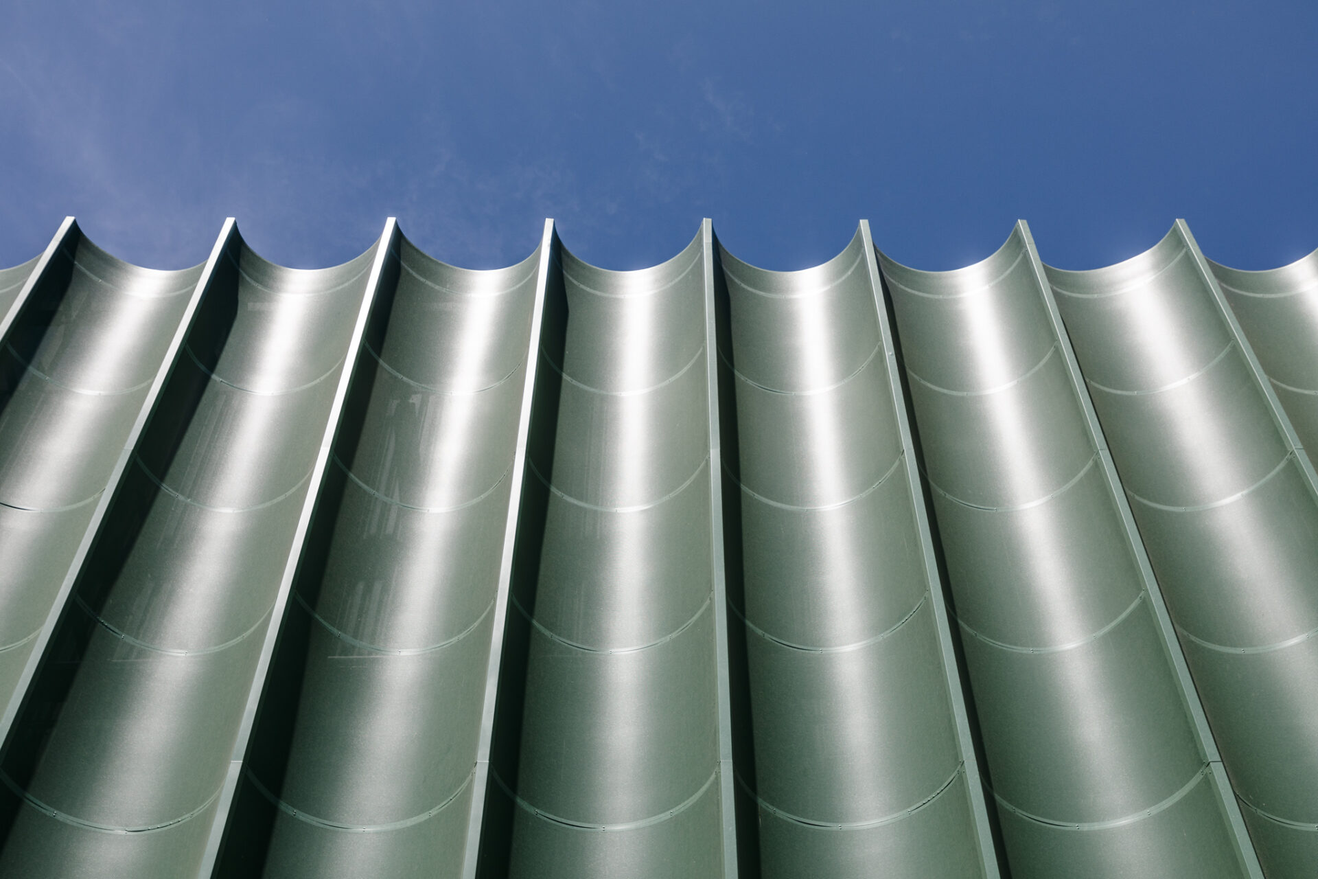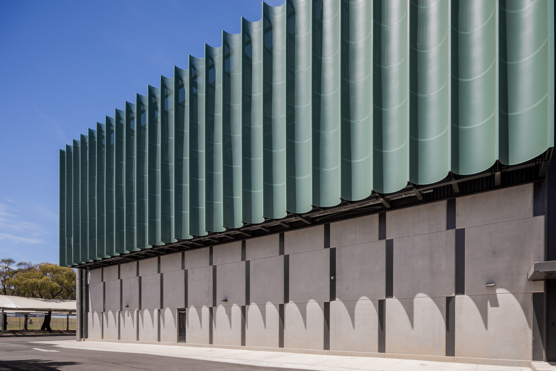 Louvreclad's perforated Polaris Series was crafted into semi-circular 8.8-metre-high concave aluminium screens. These sage green installations cast dramatic shadows to the north and south exteriors, becoming a visual centrepiece. This design is mirrored in the precast concrete formwork on the east and west exteriors, complemented by Louvreclad Platinum Series custom aluminium vertical cladding.