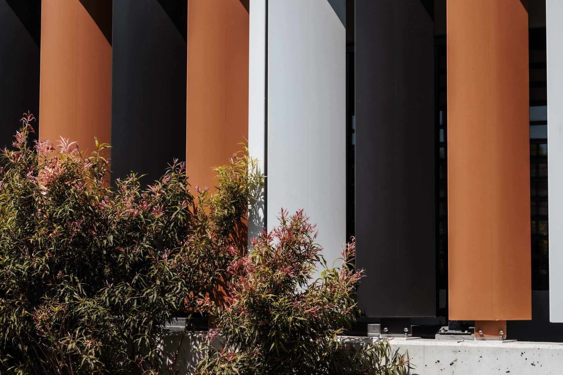 Merlin Series® Elliptical Louvre Blades were installed across the north elevation on Levels 1 and 2, providing solar shading to multiple window screen locations. Powder-coated finishes include Dulux® Duratec® Zeus Monument Matt (90Z8189M), Dulux® Duratec® Elements Surfmist Flat (90E1330Z), and Dulux® Duratec® Copper Coin Pearl Matt (90T4350K).