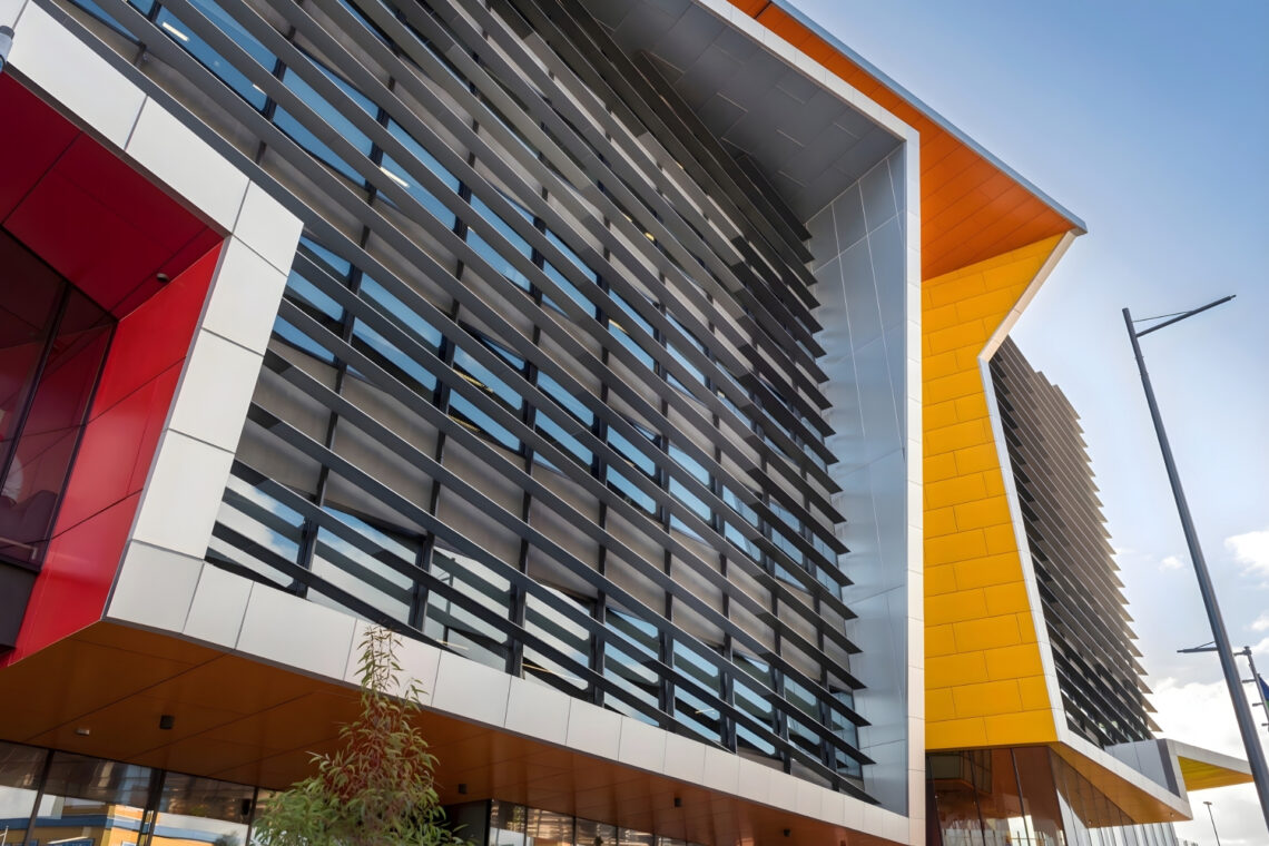 For example, the perforations could be no greater than 8mm to ensure no fingers could get trapped, or anyone able to climb the screens The final design comprised of flat panel screens showcasing Polaris Series® 105 Round Hole interrupted by a series of custom folded screens in Polaris Series® 202 8.0x50mm Slot Perforated aluminium screens. The design then utilised three different Dulux Duratec colours to provide contrast between the panels To ensure adequate sun protection on the North Façade, a combination of Louvreclad’s Caprice® and Scarborough Series® were installed in a custom designed vertical and horizontal screen configuration. The Caprice Series® 634 vertical sun blades were supported by steel outriggers, while the horizontal Scarborough Series® 650 fins were fixed to the Caprice panels with custom fabricated 6mm aluminium end plates. Our team enjoyed partnering with James Cubitt Architects and Dickinson Constructions on this project, which is a perfect example of how Early Design Involvement leads to highly successful project!