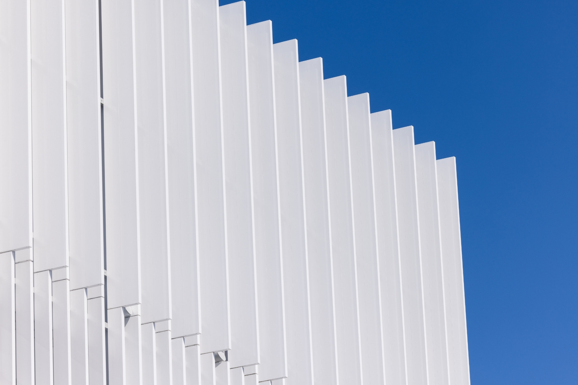 On the west elevation, Louvreclad’s Caprice Series® Modular Fins became the defining feature. Supplied as prefabricated panel assemblies, they streamlined installation while ensuring consistent quality. Finished in Interpon® D2525 Pearl White Gloss, the fins create a striking vertical rhythm, complemented by Dulux® Precious® Natural Pearl Matt fixing rails that introduce subtle tonal contrast. This prefabricated approach reduced on-site labour and delivered long-term performance in a demanding retail environment.