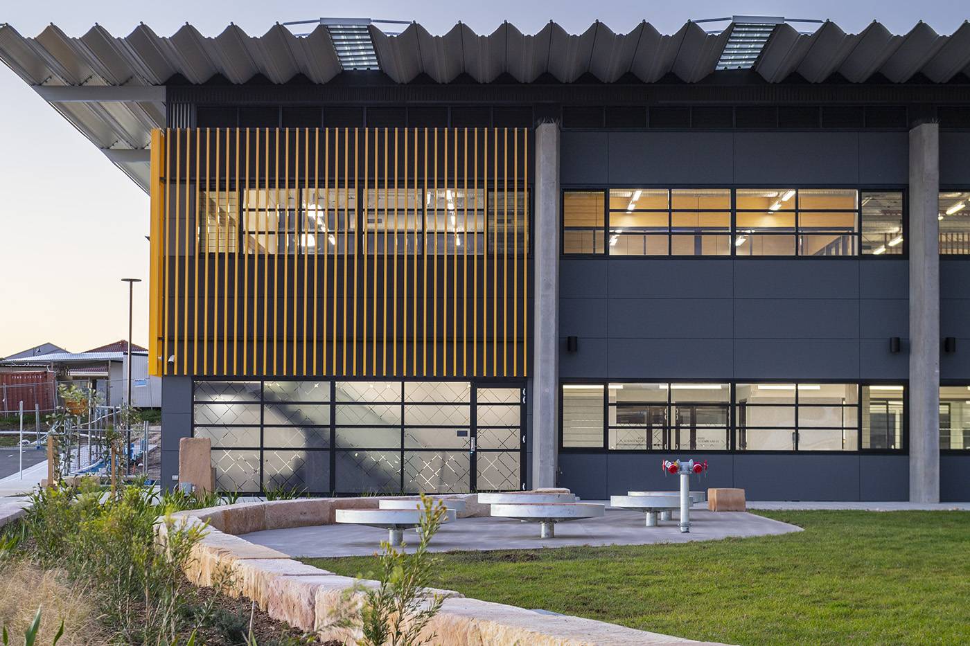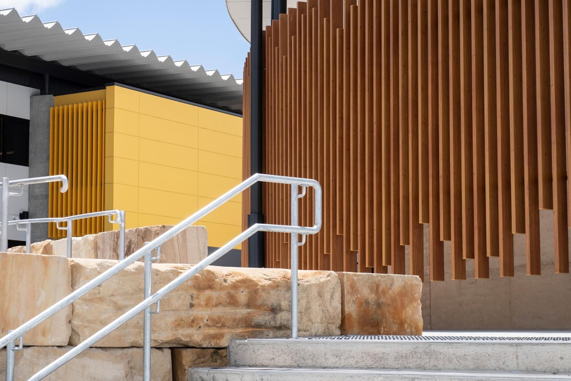 The south-west corner of Block B is then shaded utilising Barossa Series® 150×45 vertical aluminium battens with 200mm pitch. Dulux Duratec Intensity Sunshine powder coat finish provides a bold architectural feature that contrasts the grey metallic cladding panels.