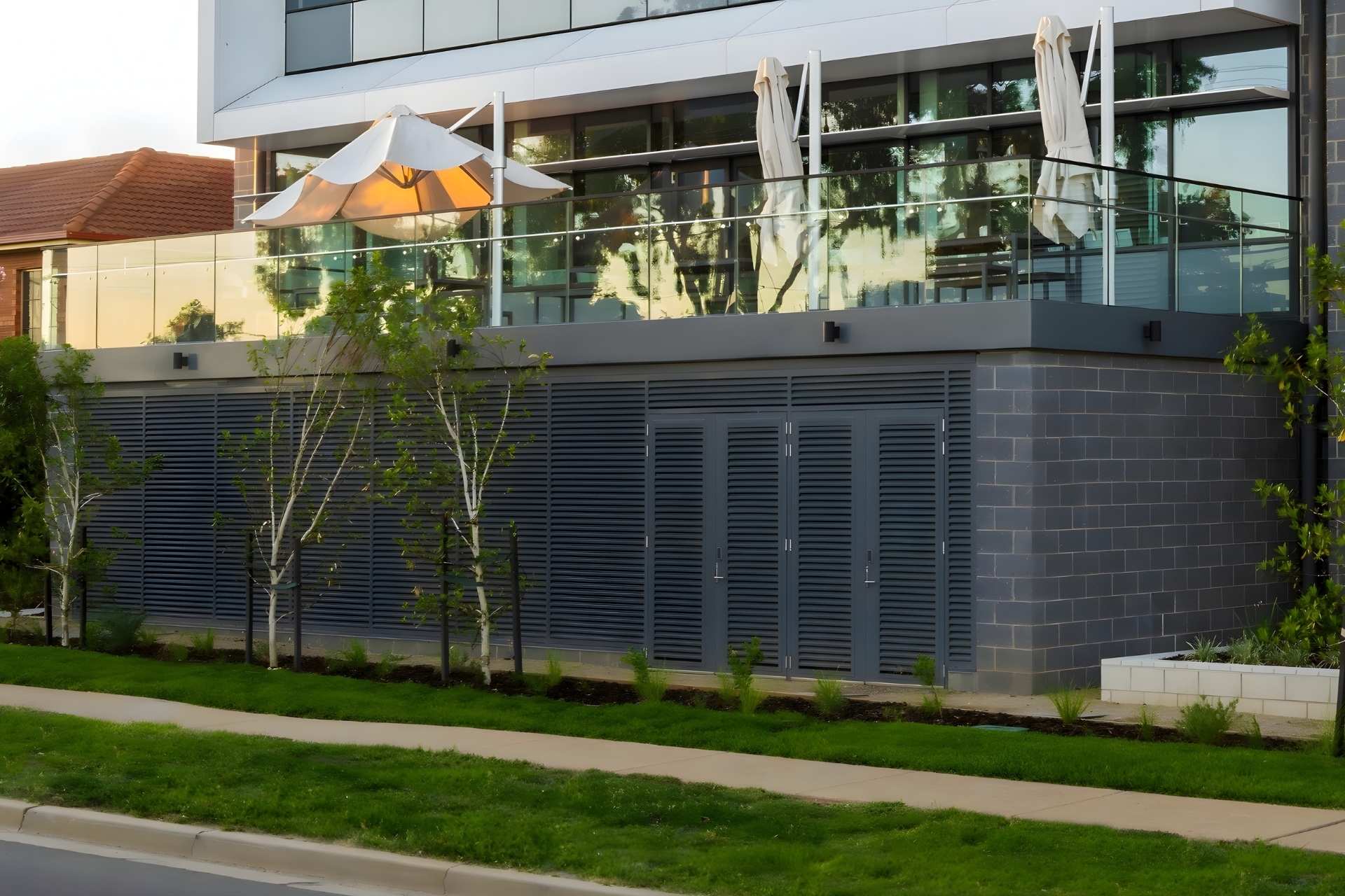 To enhance both performance and durability, Louvreclad supplied and installed high-performance louvre systems across the facility. Ellenborough Series® Chevron Louvres and integrated doors create continuous ventilated screens at ground floor elevations, including the bin store, bike and scooter store, and pump house. The system combines vertical mullions and horizontal louvre blades, with fully sealed subheads and subsills to prevent water ingress.