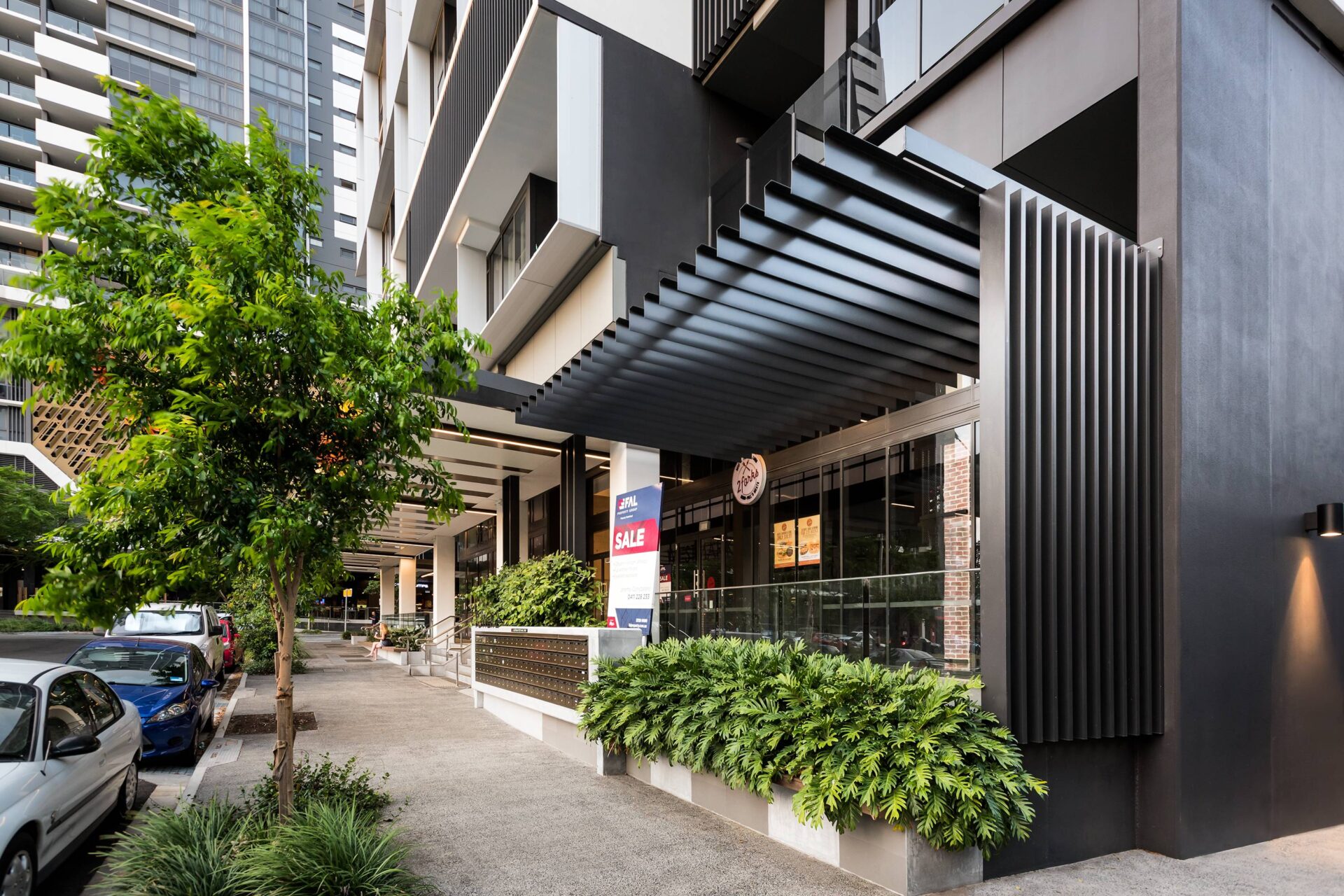 Westmark Milton looks and feels prestigious with its tall elegance and sweeping views providing superior quality inner city living. Designed by Bureau Proberts, Louvreclad’s Barossa and Caprice Series® were specified in various sizes providing a visual feature throughout the many facets of this multi-residential twin tower development. Louvreclad designed, engineered, supplied and installed Barossa Series® 150×45 and 45×45 powder coated aluminium vertical batten screens that span 6m over two levels and provide natural ventilation to the podium car parks. To maintain the continuous aesthetics, Louvreclad have incorporated a pin-plate expansion joint at mid-height which cannot be seen to the unknowing eye and on careful inspection is visible only as a faint hair line join. These vertical linear screens provide character throughout the two towers with various sized extrusions giving architectural texture across the facades.